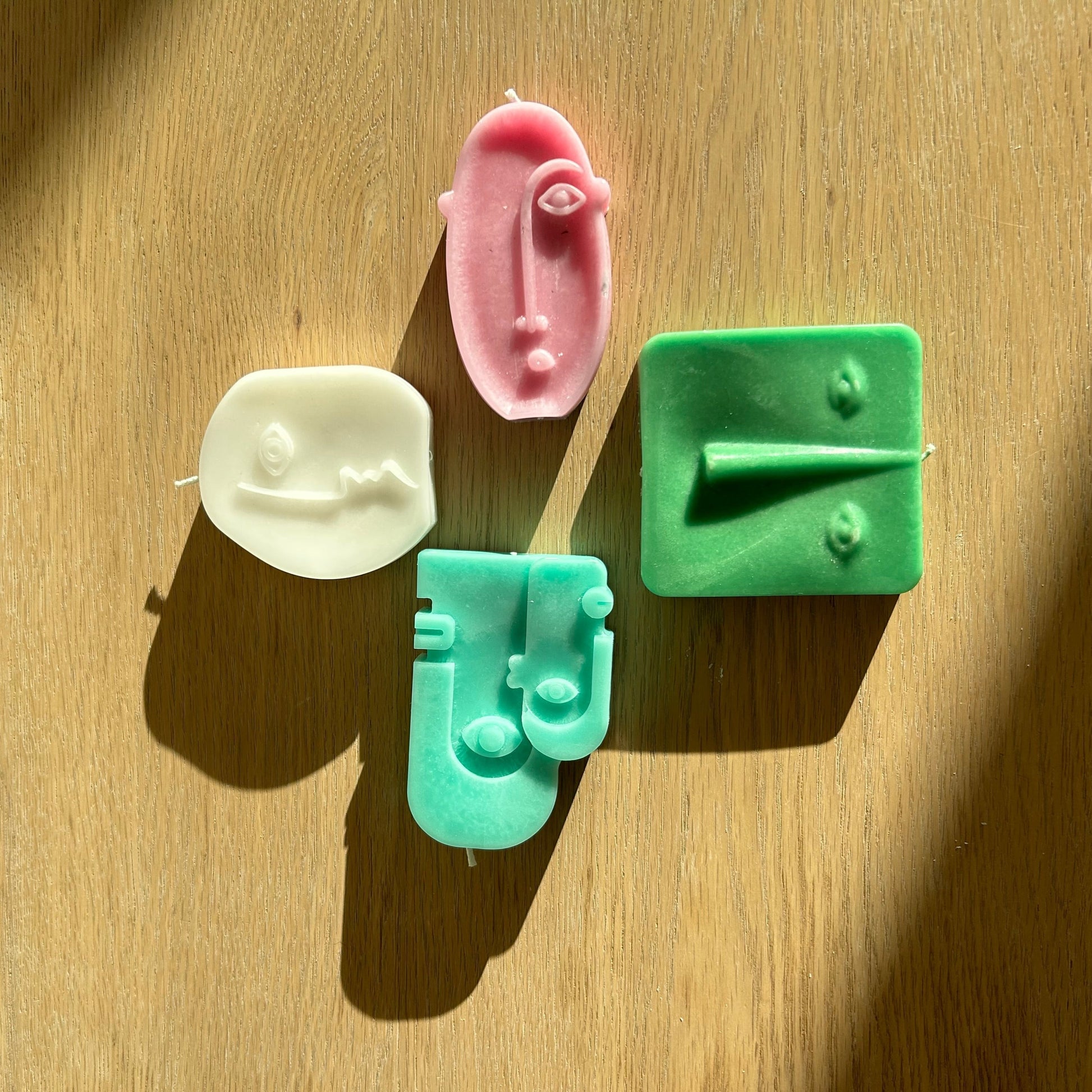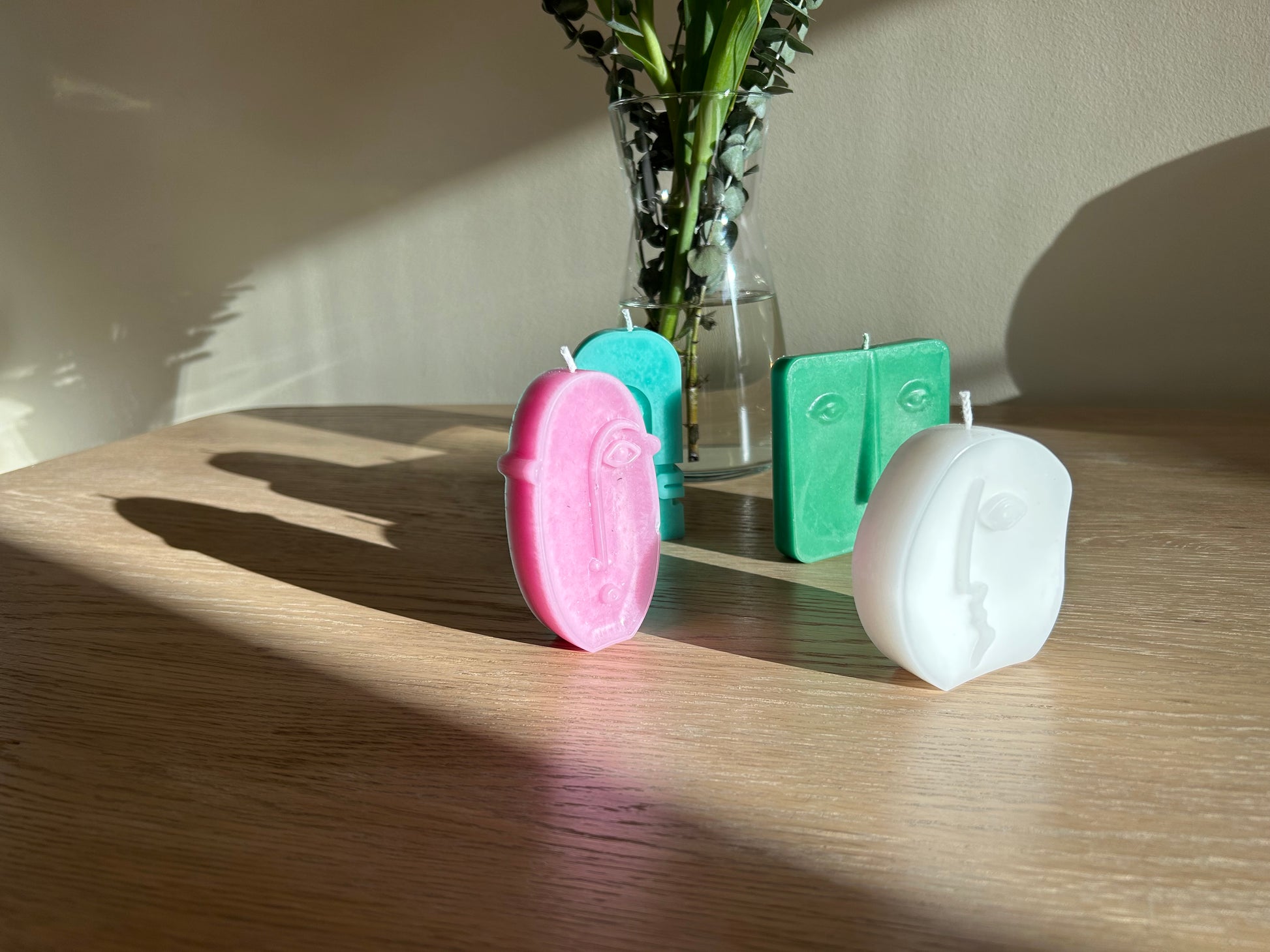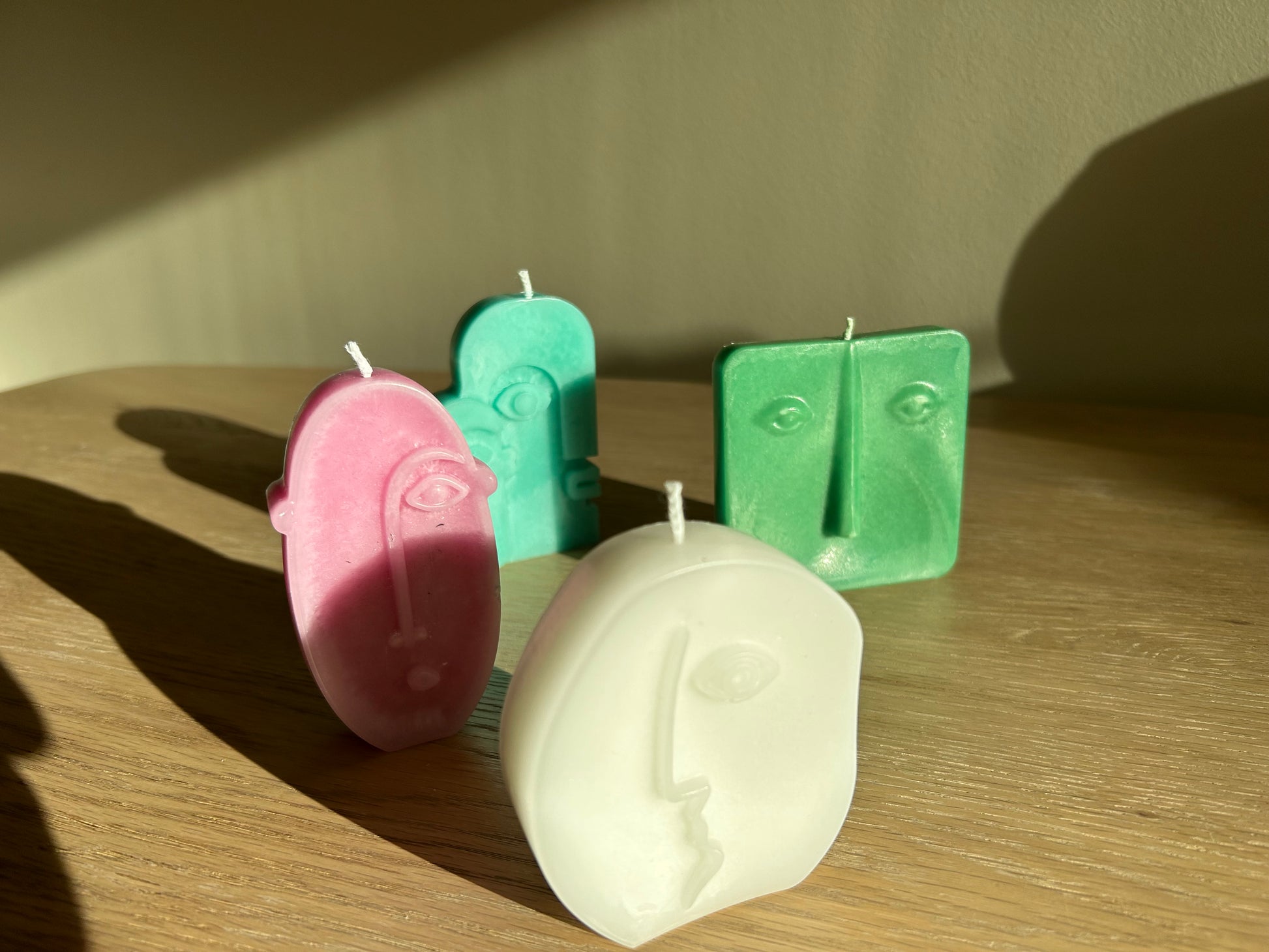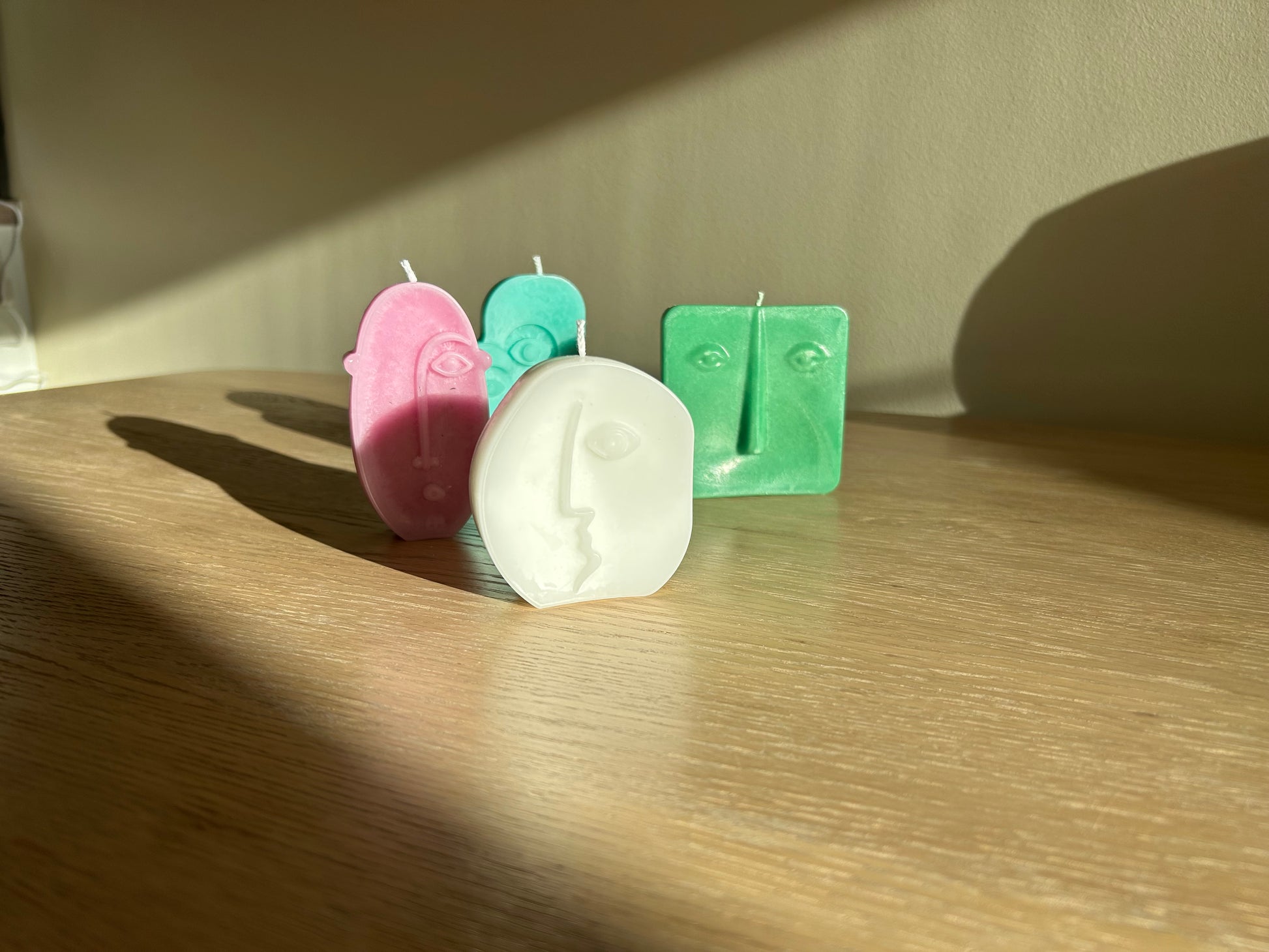 Lys formet som ansikt. Velg hvilket ansikt i hvilken farge, eller kjøp en av hver til rabattert pris.