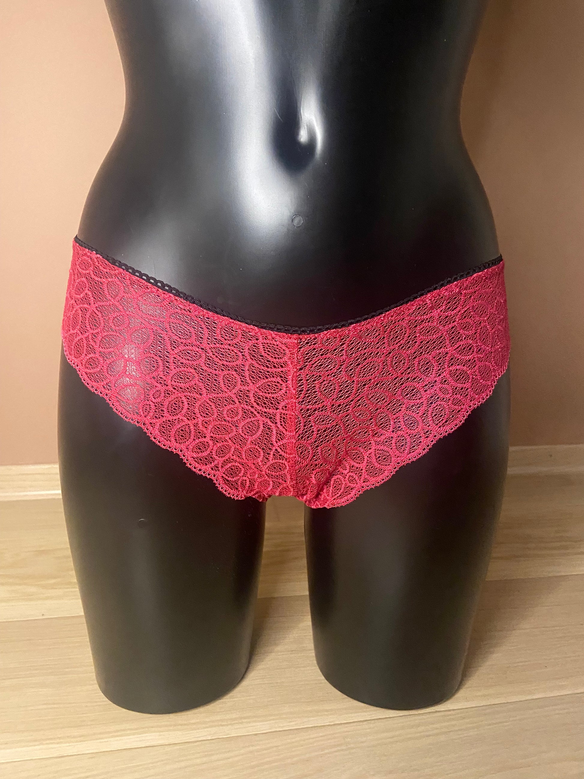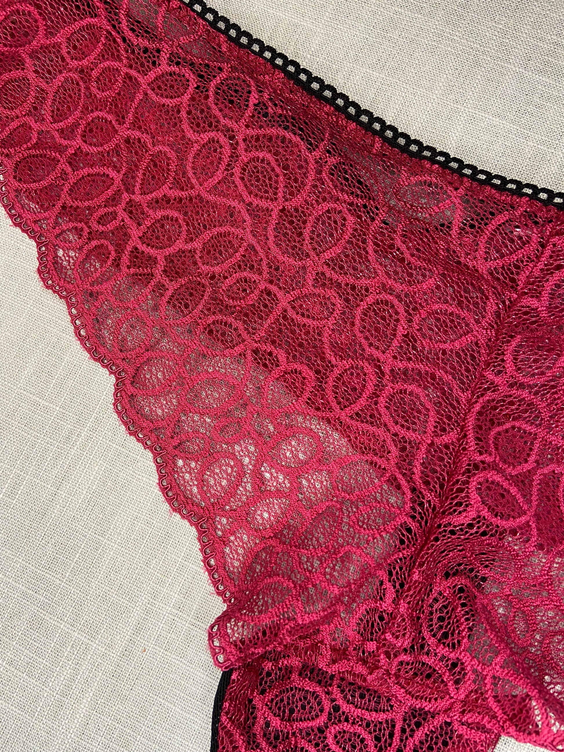 Dyp rosa blondetruse. Det finnes også noen varianter med sorte detaljer. Blonden er delikat og myk, med en varm dyp mørk rød-rosa farge og et spennede mønster.