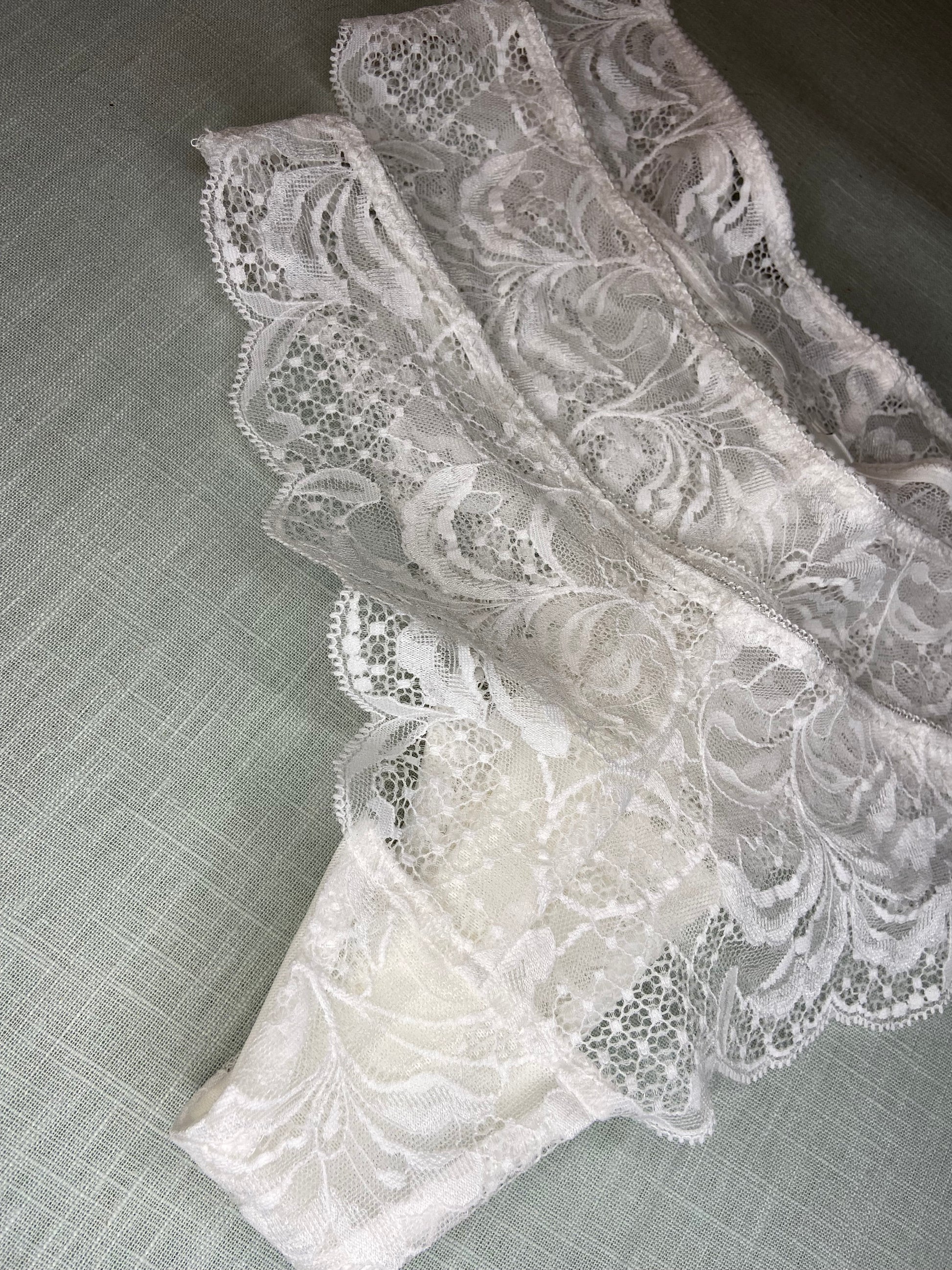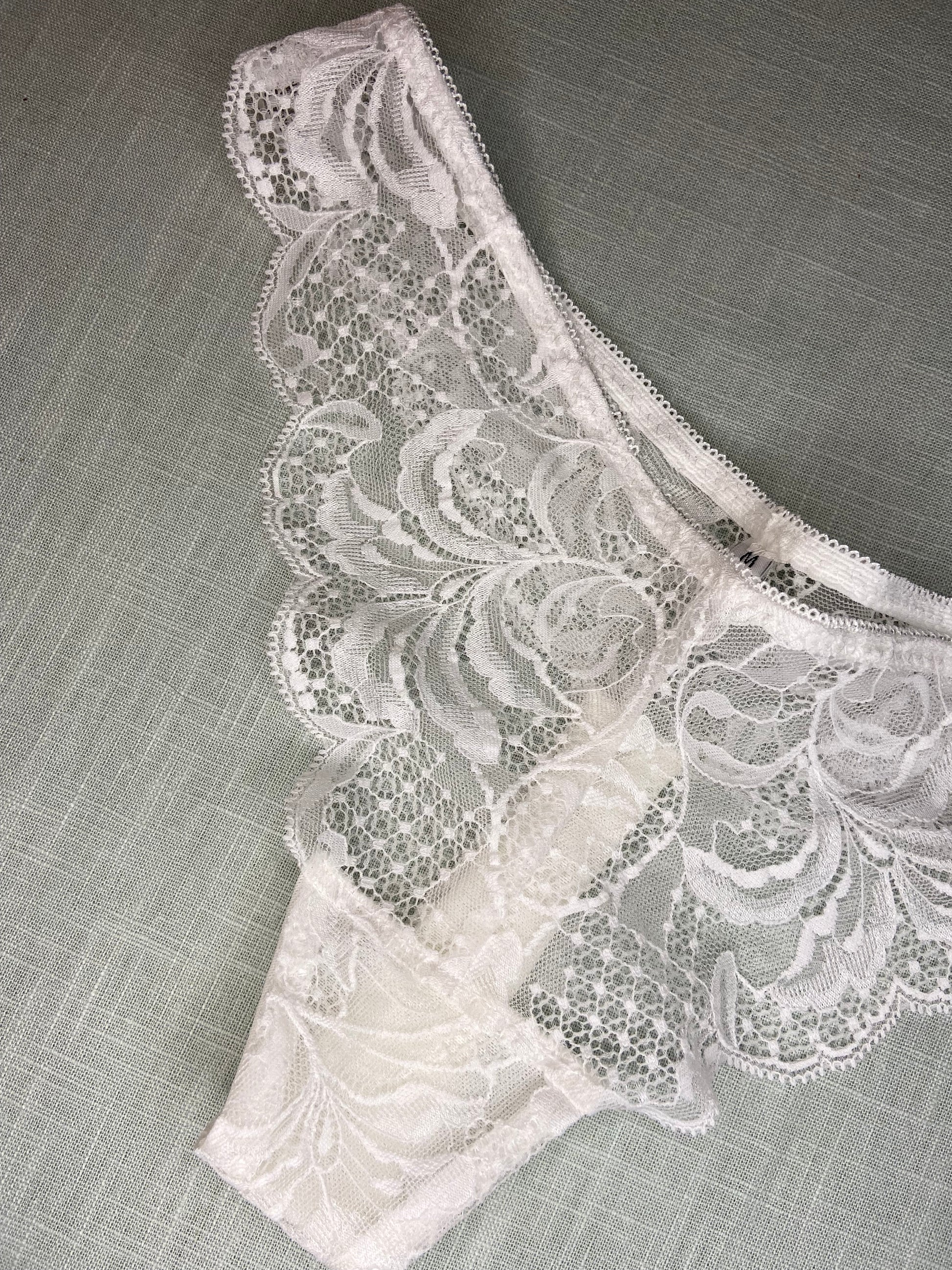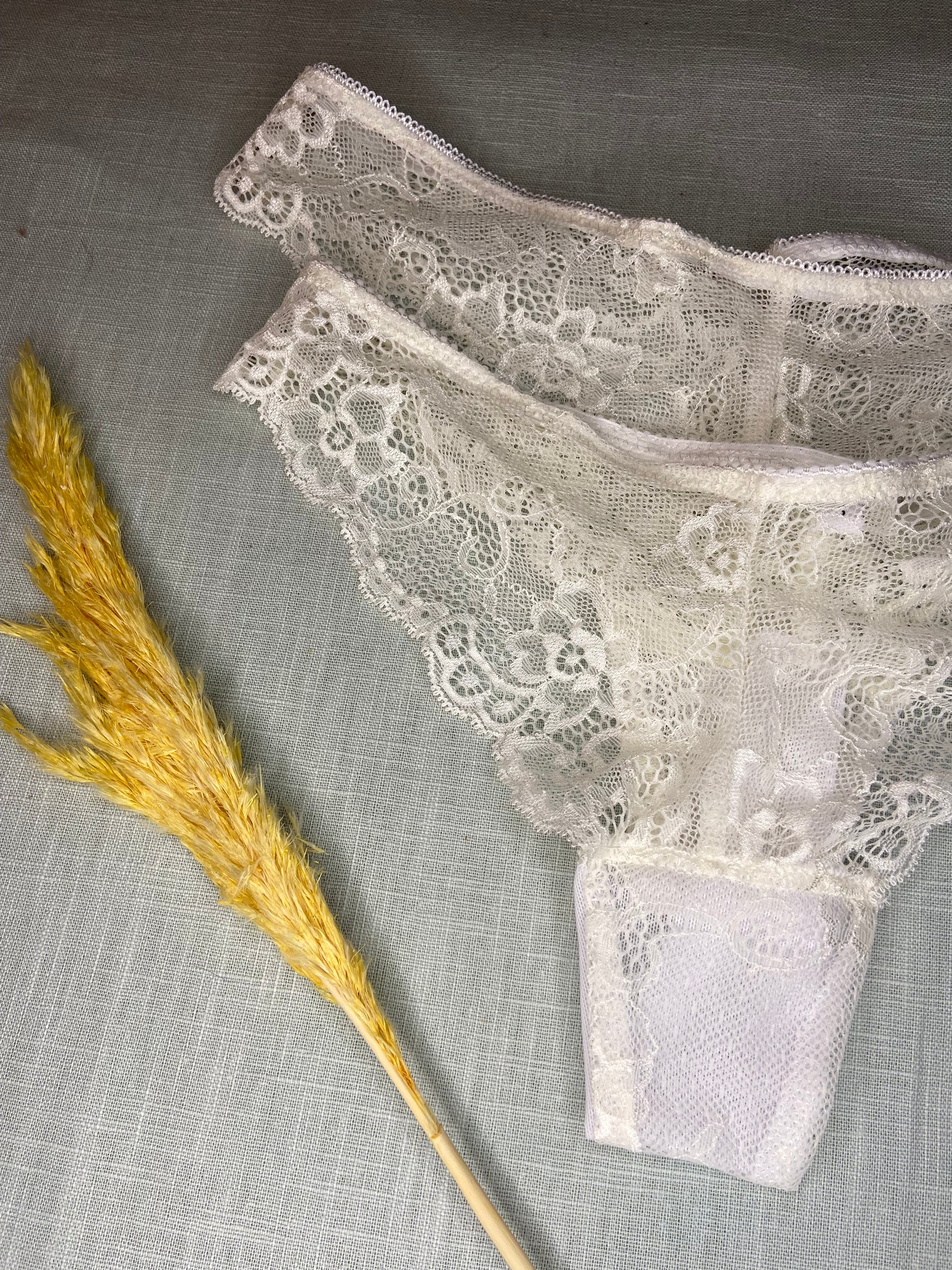 Hvit blondetruse. Finnes også noen truser i off-white. Blonden er delikat og myk, med nydelige, store blomster. Trusen er håndlaget.