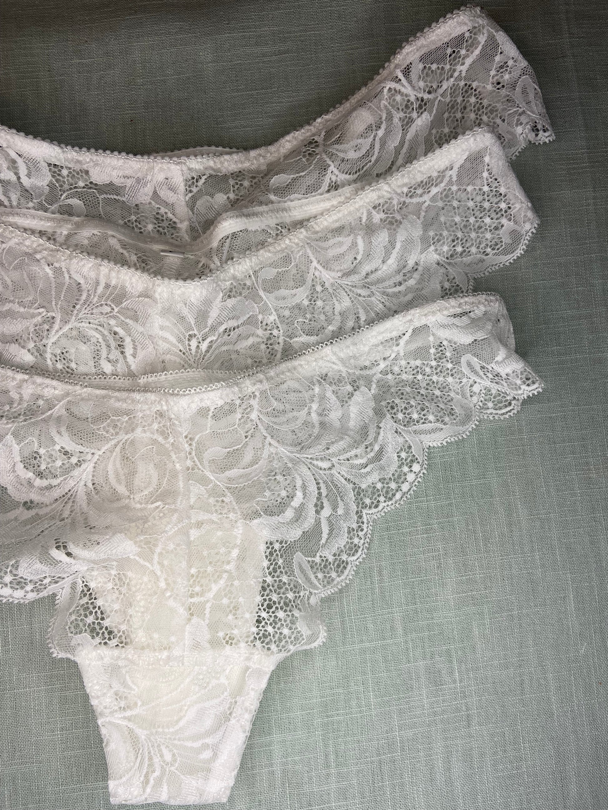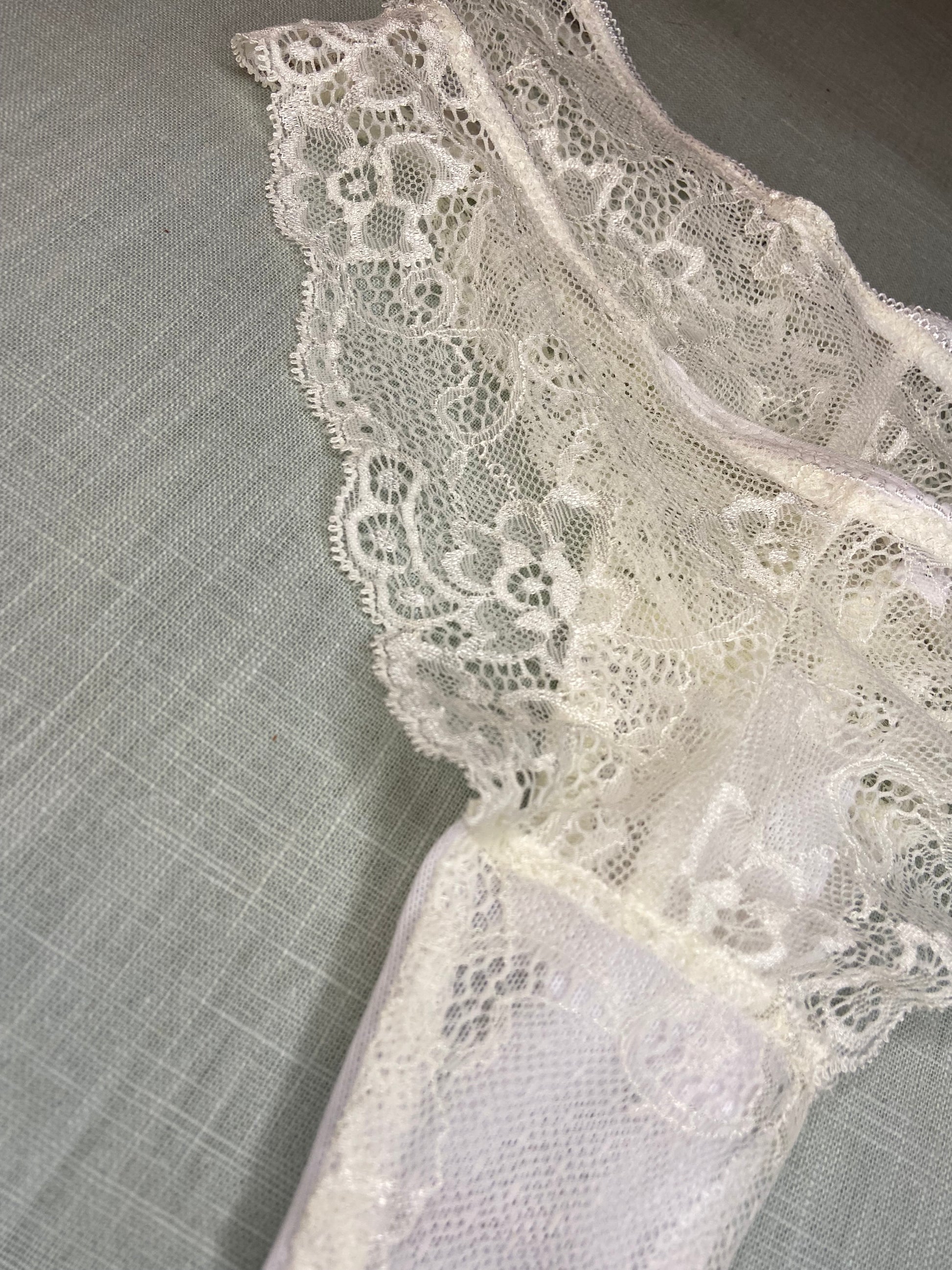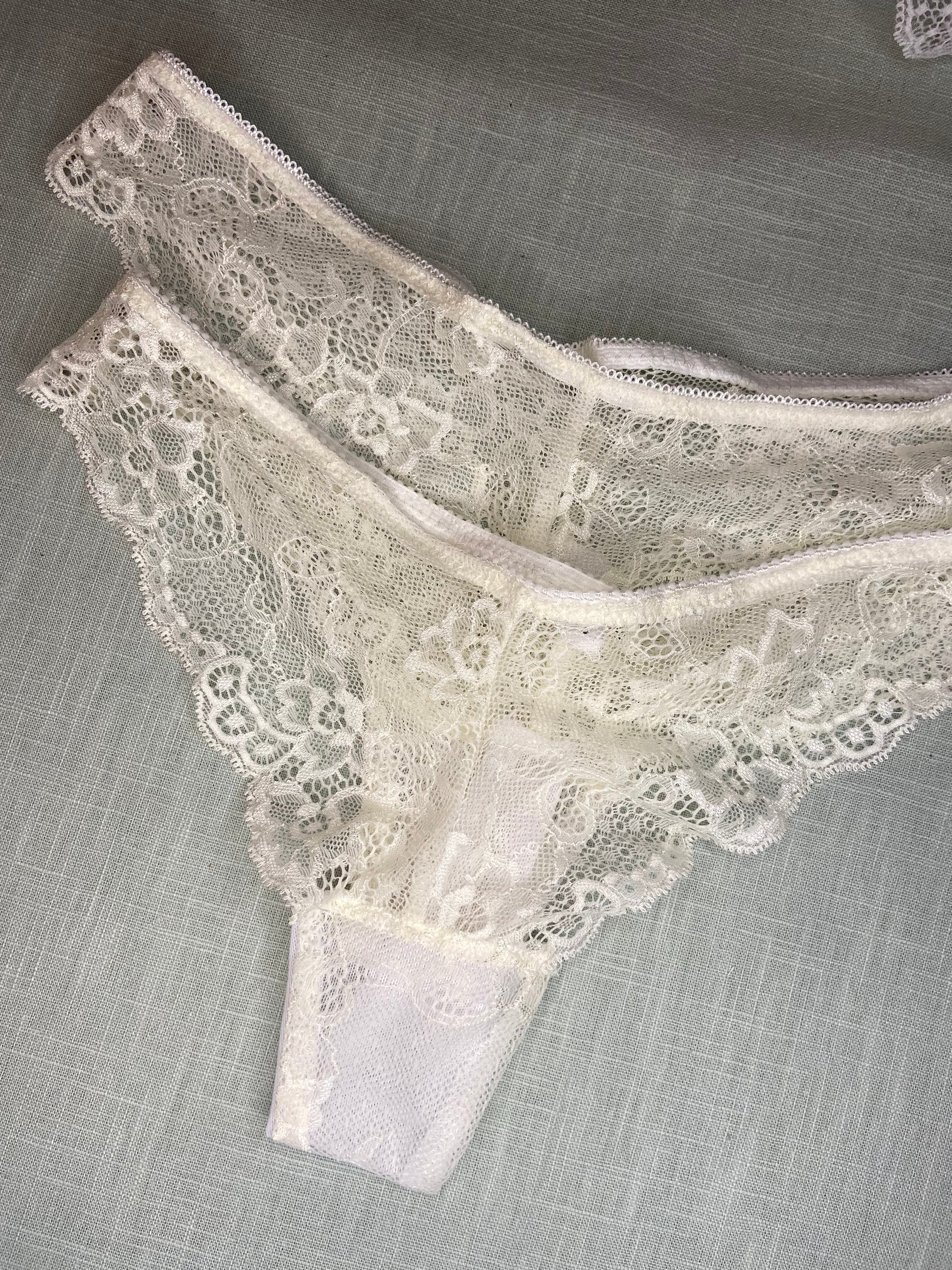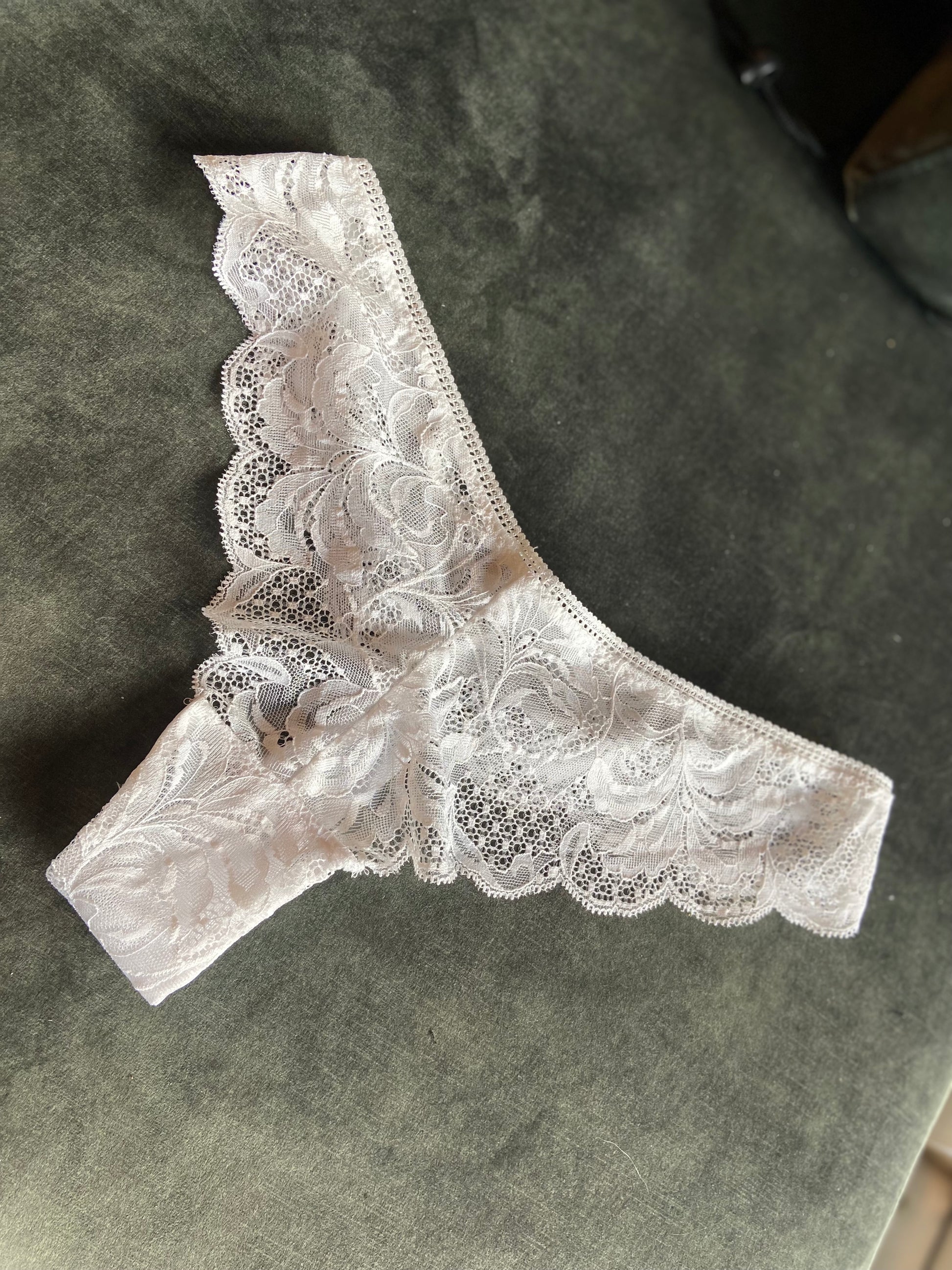 Hvit blondetruse. Finnes også noen truser i off-white. Blonden er delikat og myk, med nydelige, store blomster. Trusen er håndlaget.