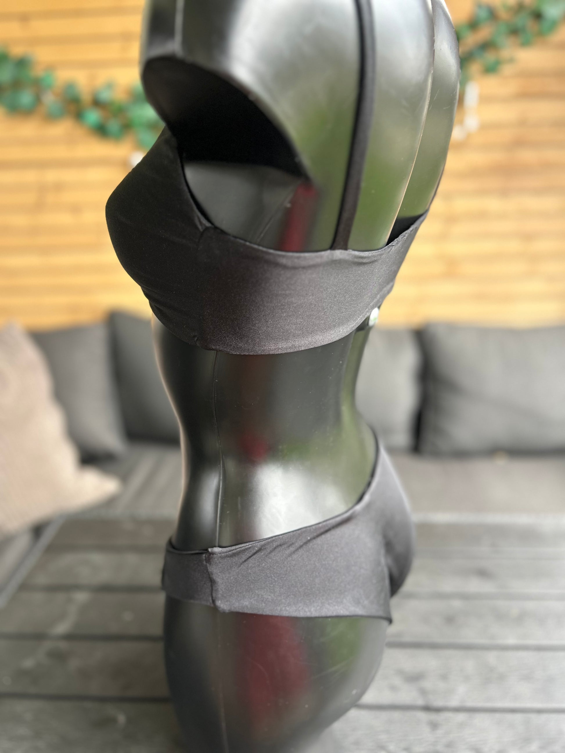 Bikinisettet inneholder en bikinitruse og en bikinitopp i matchende farge. Velg den fargen du liker best! Jeg syr bikinien når du har lagt inn bestillingen. Bikinitoppen har en knute foran som gir "jentene" et løft. Bikinitrusen har lavt liv og en cheeky bakside.