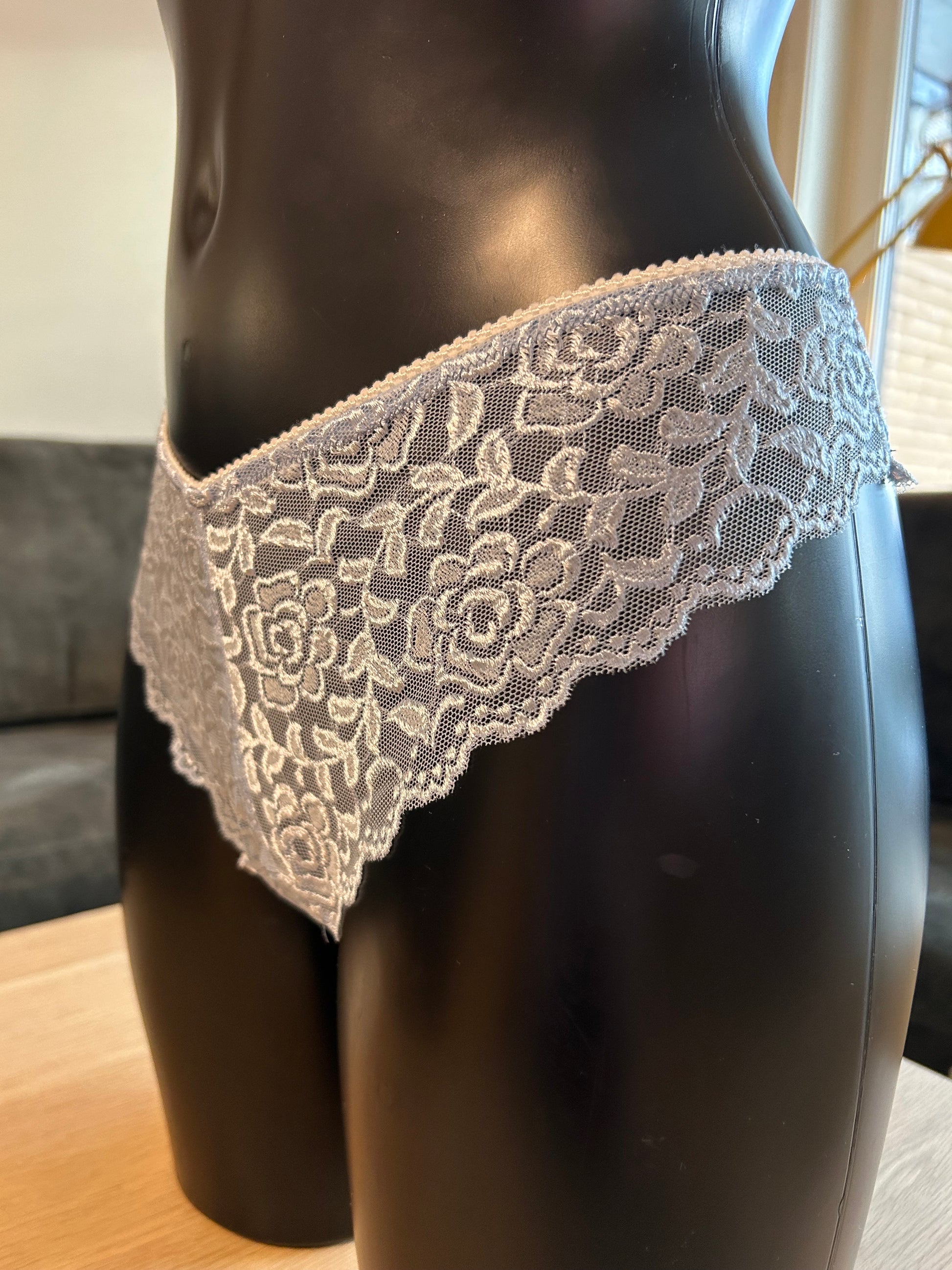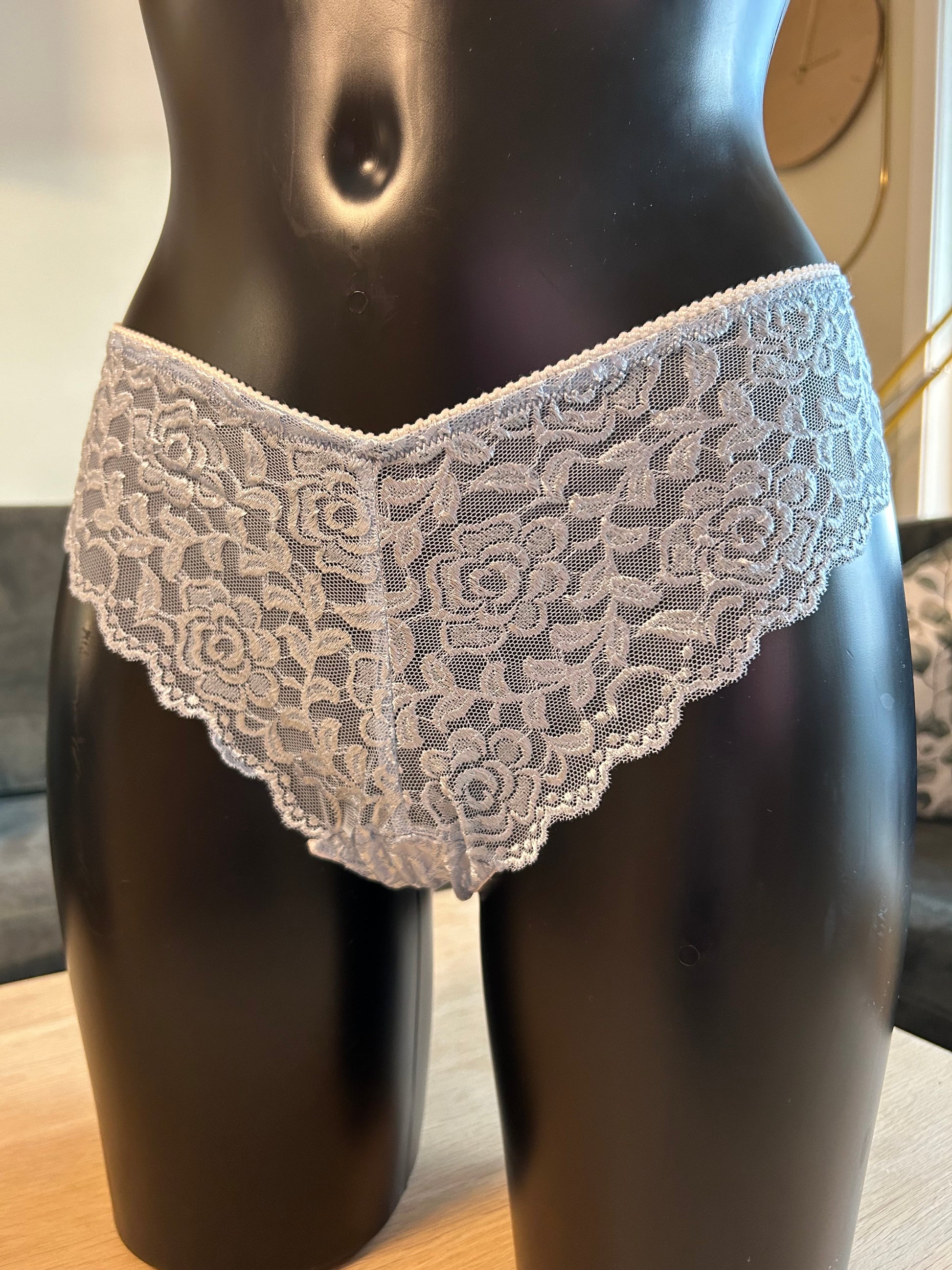 Lyseblå blondetruse, håndlaget. På innsiden av trusen er det bambus for en mer behagelig og pustende truse