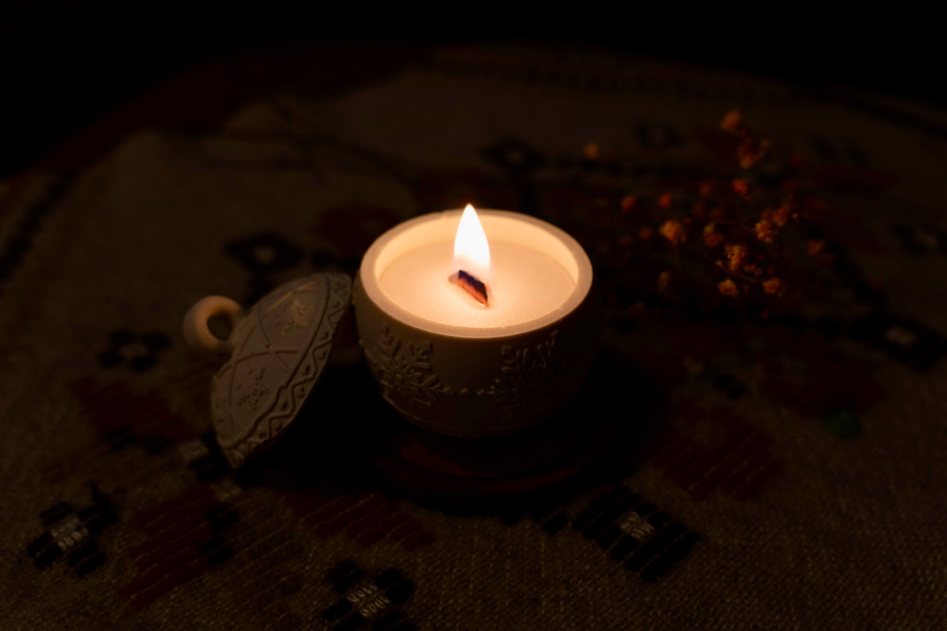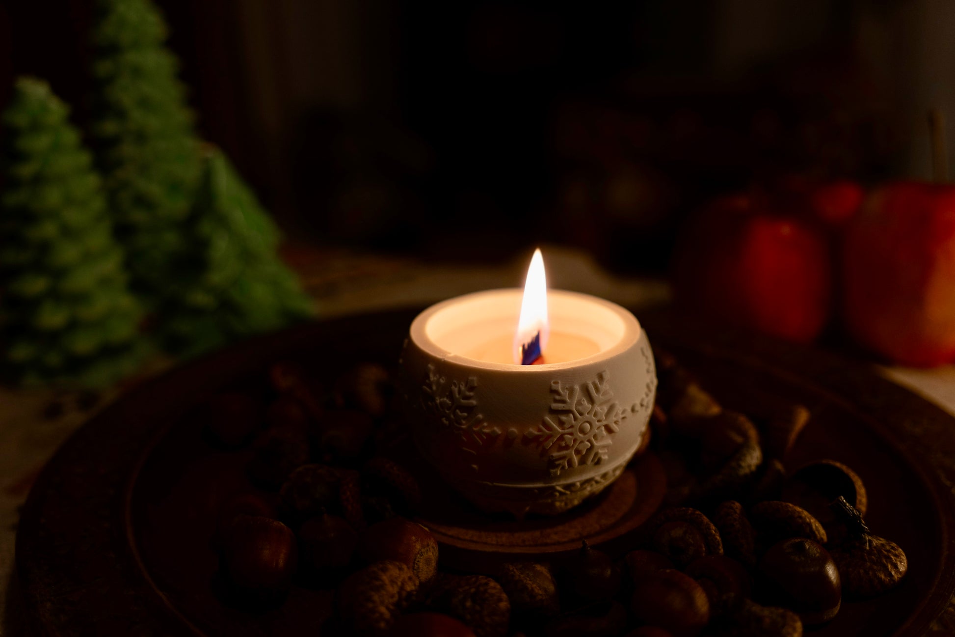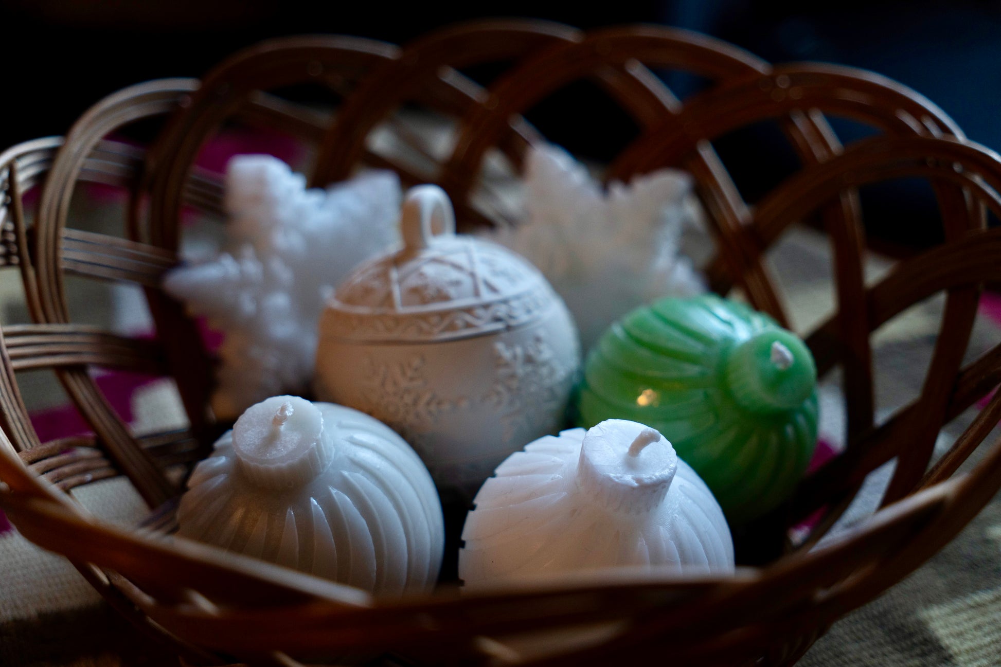 Julekule du kan åpne for å tenne på. Kulen er støpt i jesmonite og fylt med 100 % stearin. Det er brukt treveke som knitrer litt ekstra når man tenner på lyset i kulen.