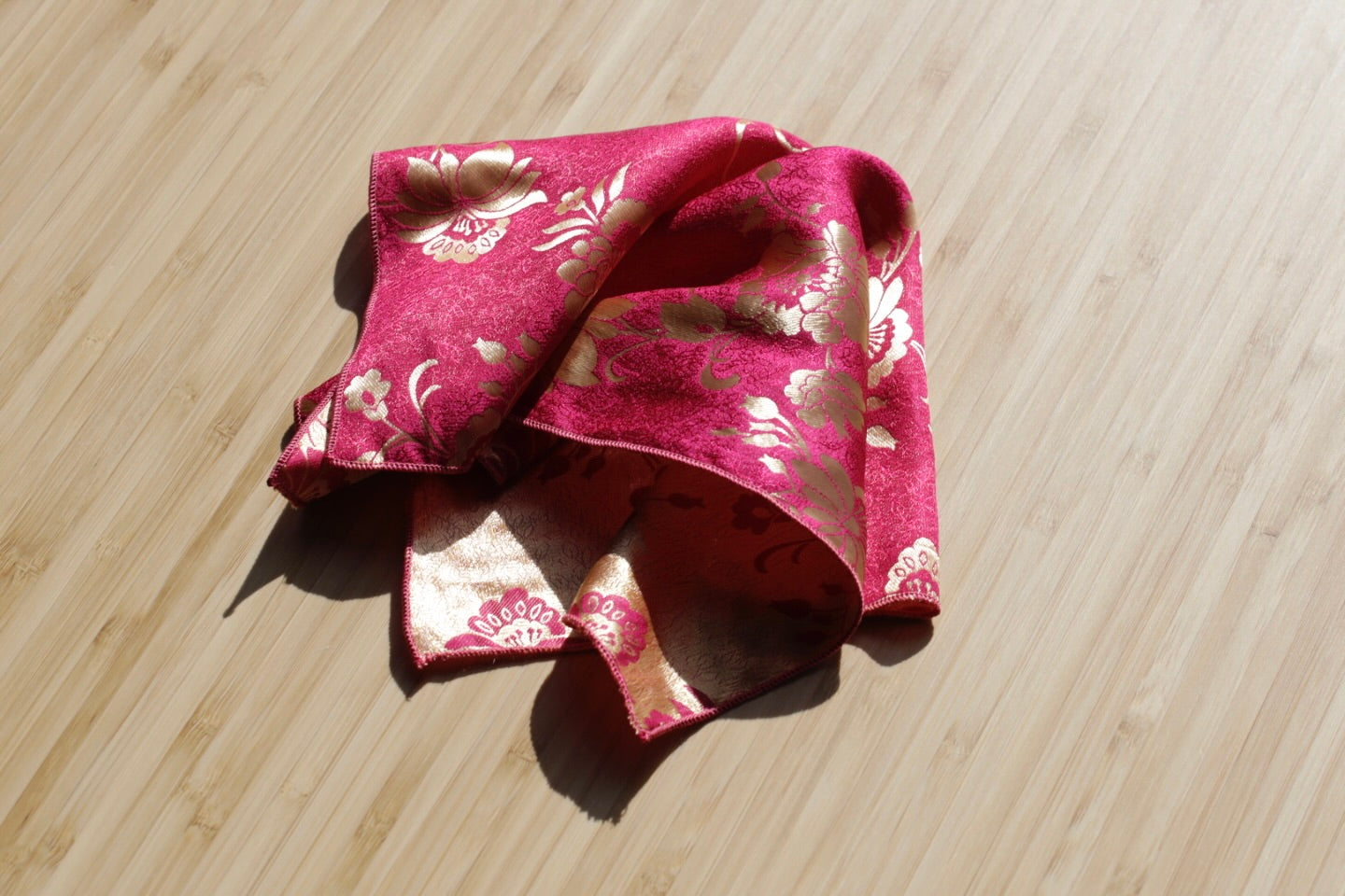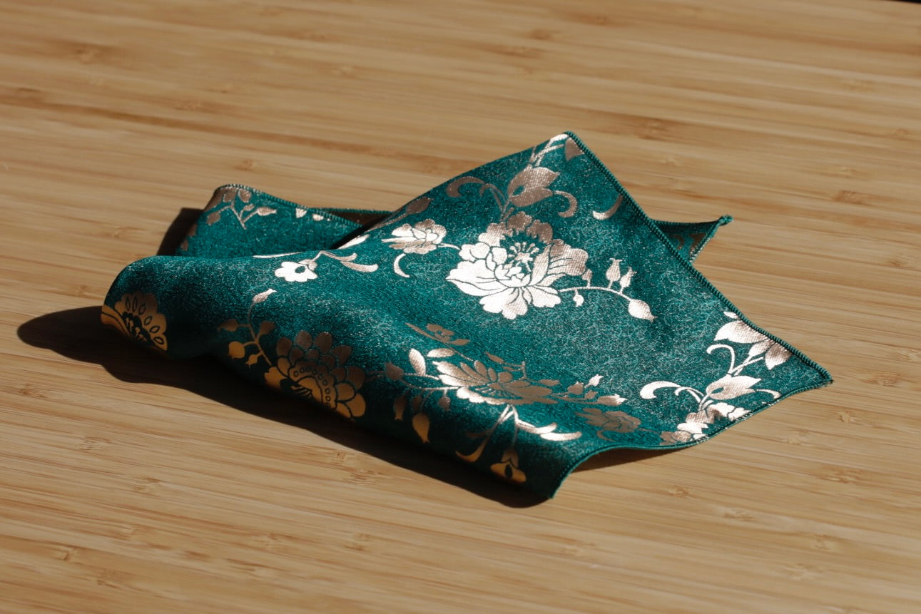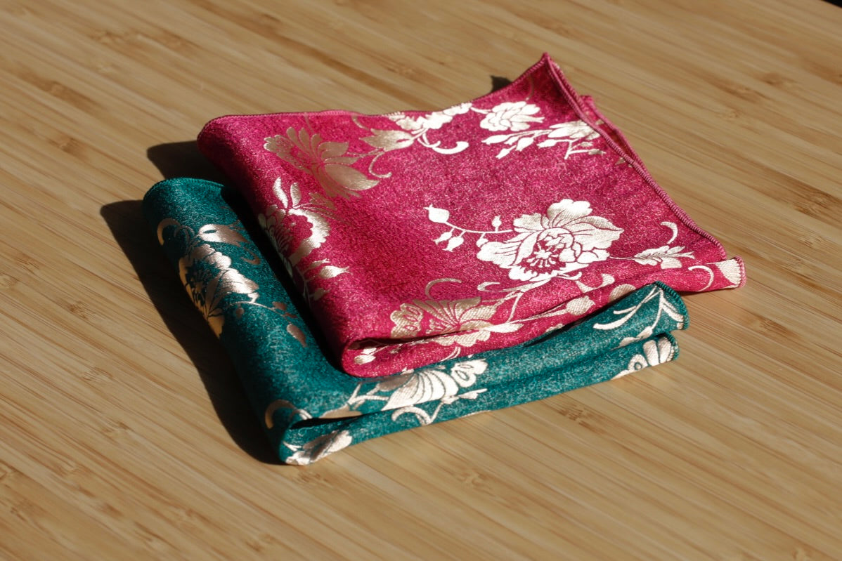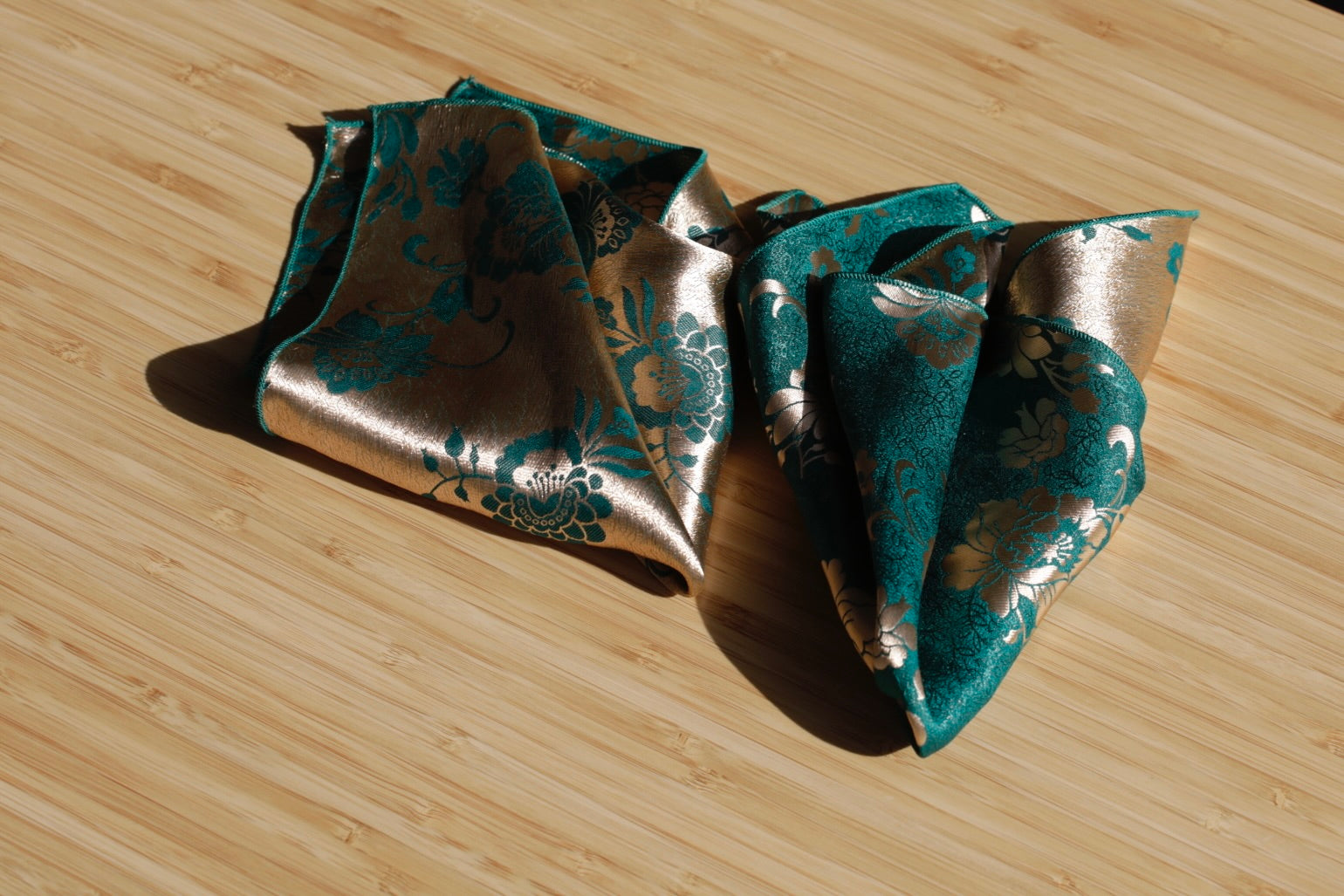 Silkebrokaden har vevde mønstre med vakre gulldetaljer og et uttrykksfullt fargespill. Stoffet er tosidig, mønsteret vises med motsatte farger på for- og vrangsiden, noe som gir skjerfet dybde og fleksibilitet i bruk. Et tørkle som skiller seg ut, og som gir et eksklusivt og personlig preg til dress eller bunad. Lommetørklærne er sydd med rullefald av silketråd.