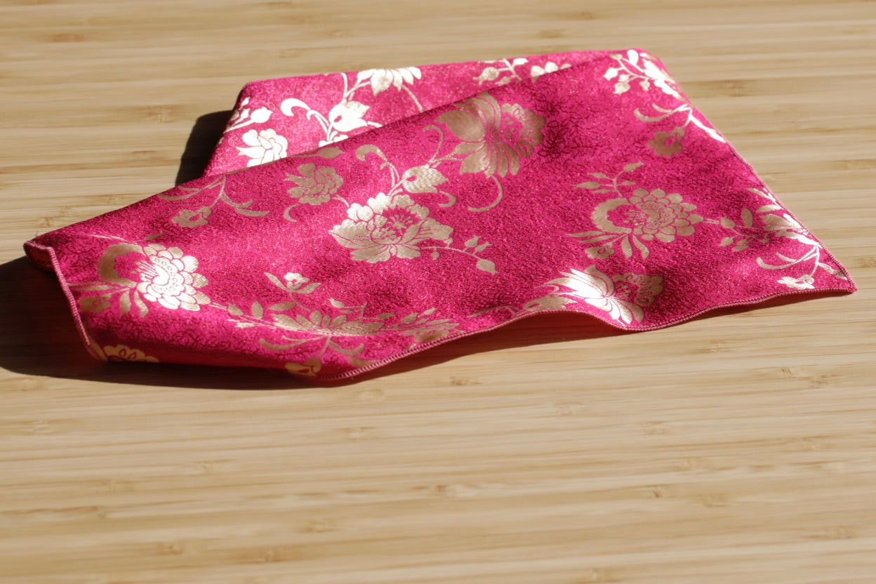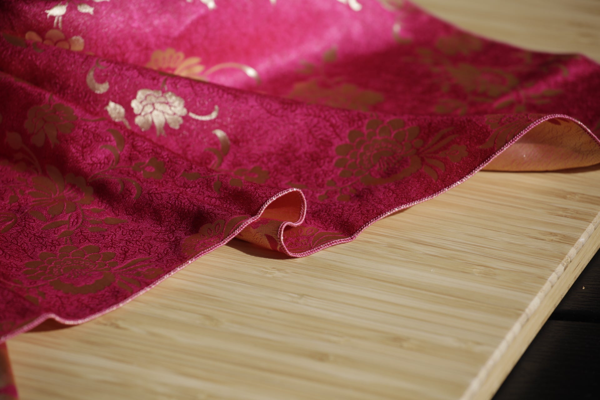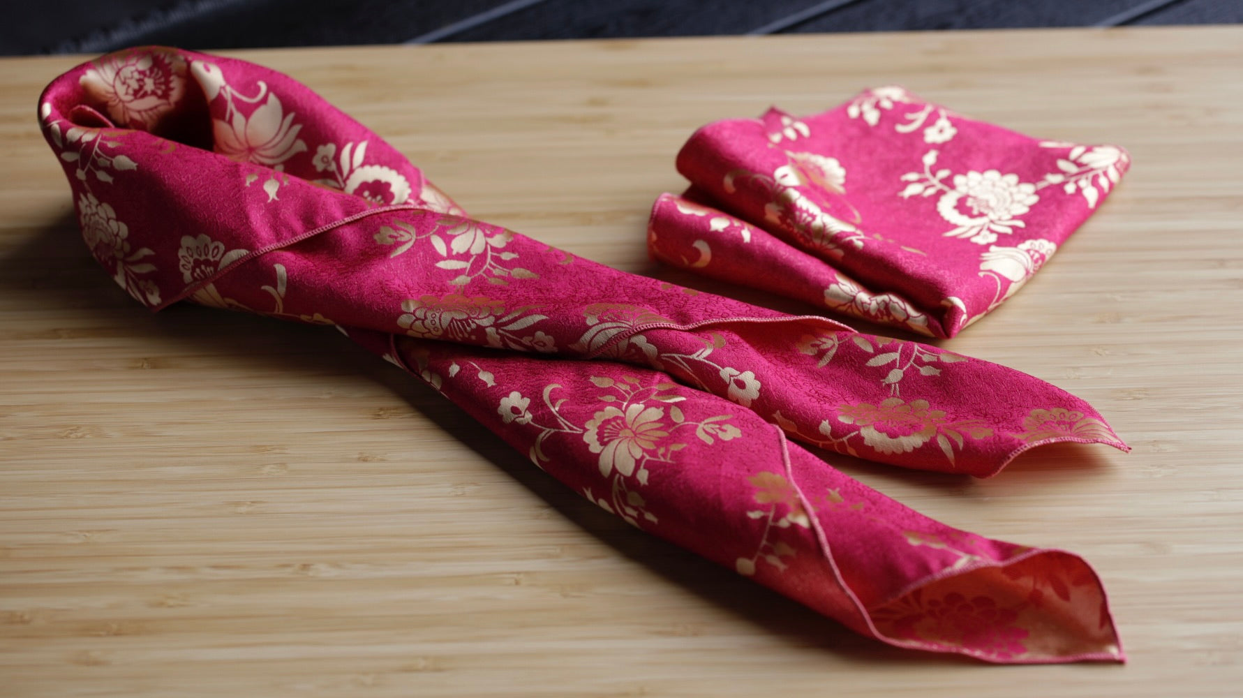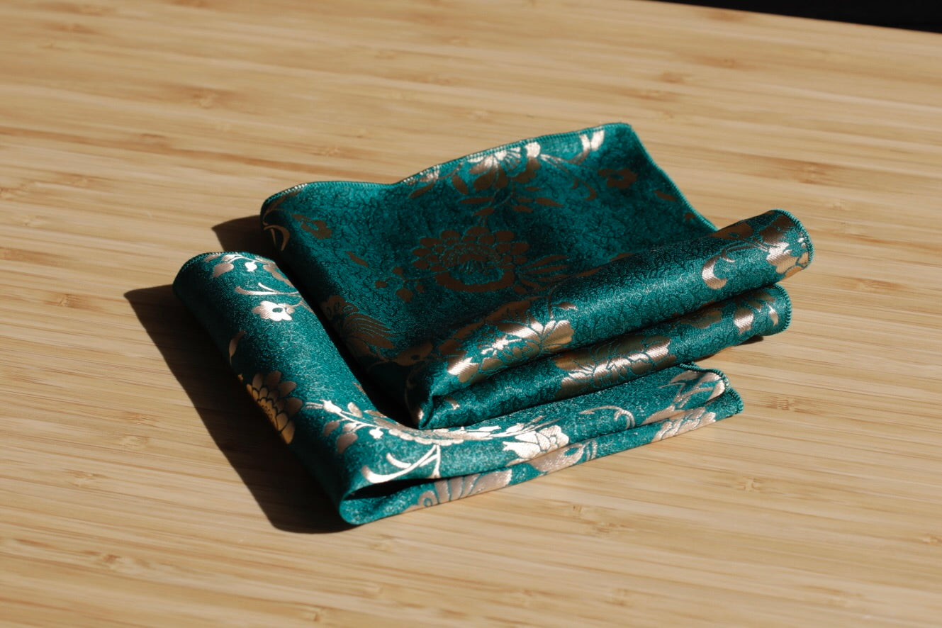 Silkebrokaden har vevde mønstre med vakre gulldetaljer og et uttrykksfullt fargespill. Stoffet er tosidig, mønsteret vises med motsatte farger på for- og vrangsiden, noe som gir skjerfet dybde og fleksibilitet i bruk. Et tørkle som skiller seg ut, og som gir et eksklusivt og personlig preg til dress eller bunad. Lommetørklærne er sydd med rullefald av silketråd.