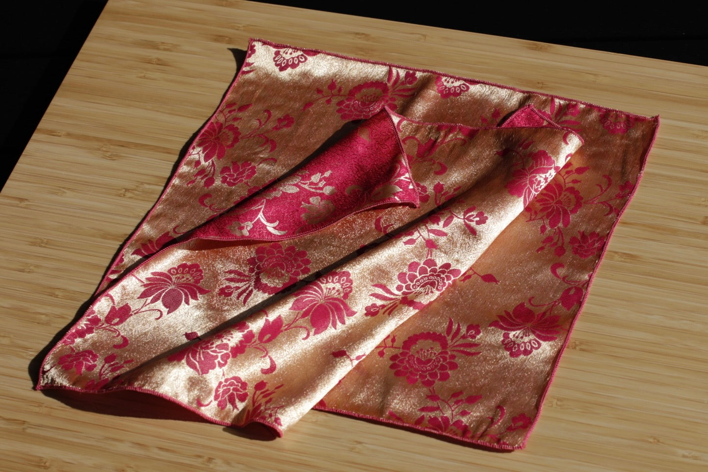 Laget av 100 % silke, sydd med rullefald av silketråd i kantene.