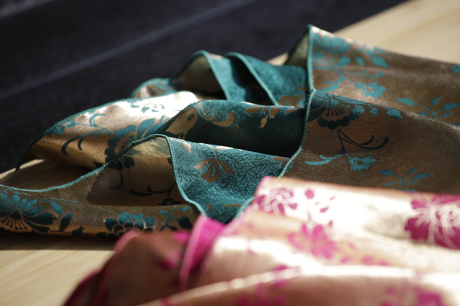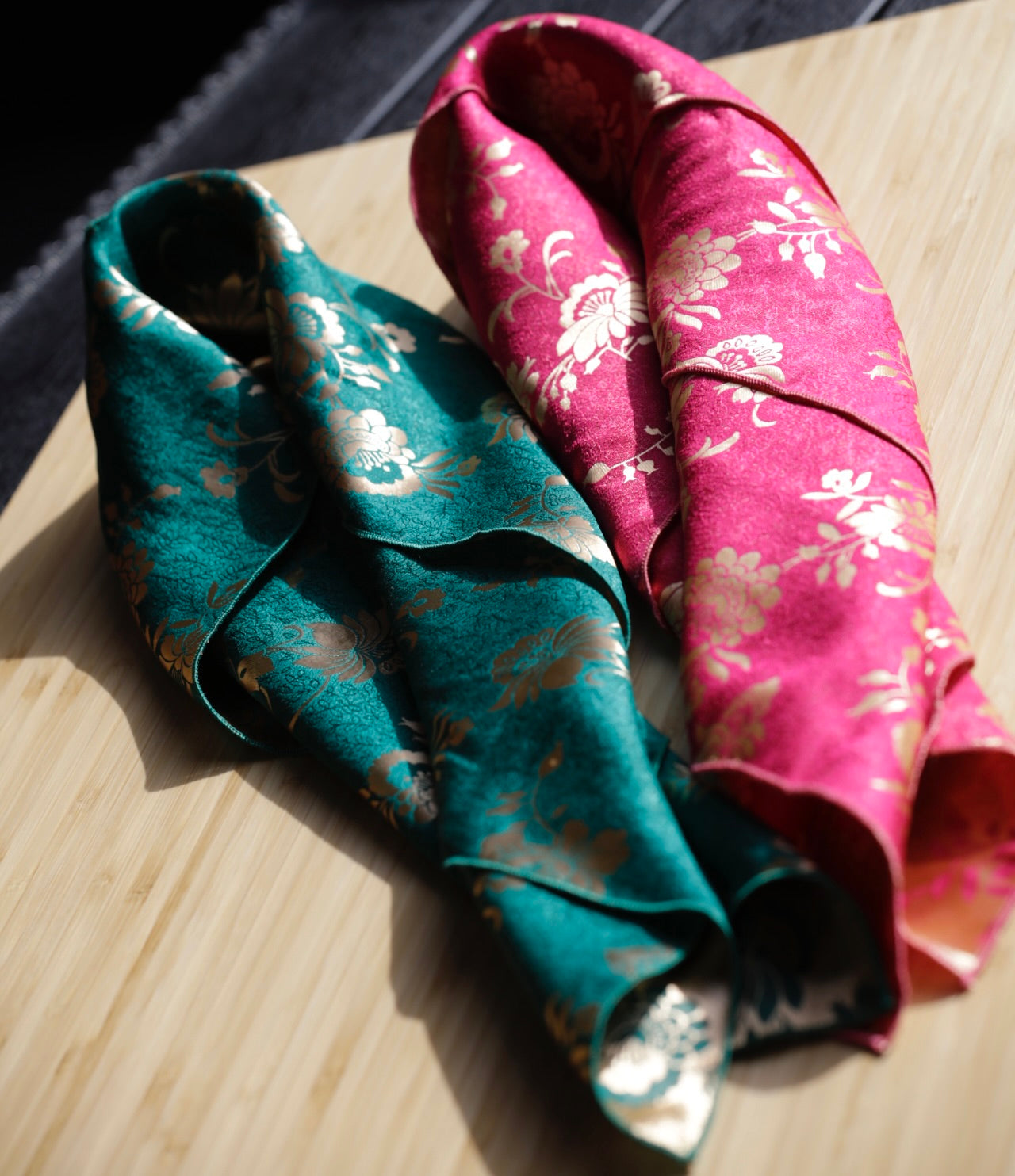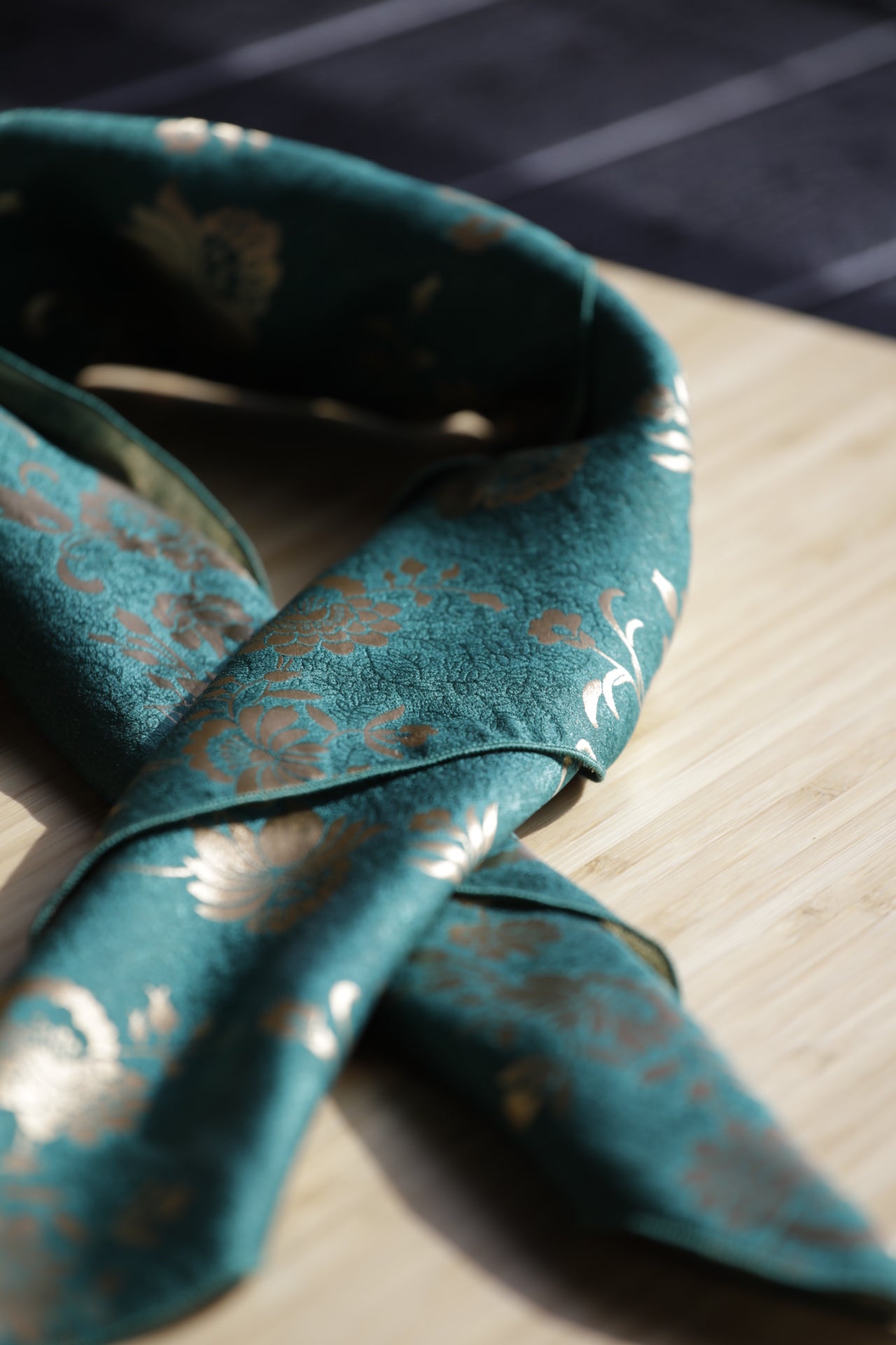 Silkebrokaden har vevde mønstre med vakre gulldetaljer og et uttrykksfullt fargespill. Stoffet er tosidig, mønsteret vises med motsatte farger på for- og vrangsiden, noe som gir skjerfet dybde og fleksibilitet i bruk. Et skjerf som virkelig skiller seg ut, og som gir et eksklusivt og personlig preg til bunad eller festdrakt. I brokadeskjerfene bruker jeg silketråd til å sy med.