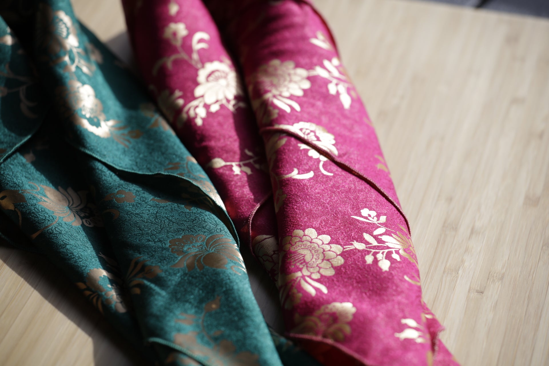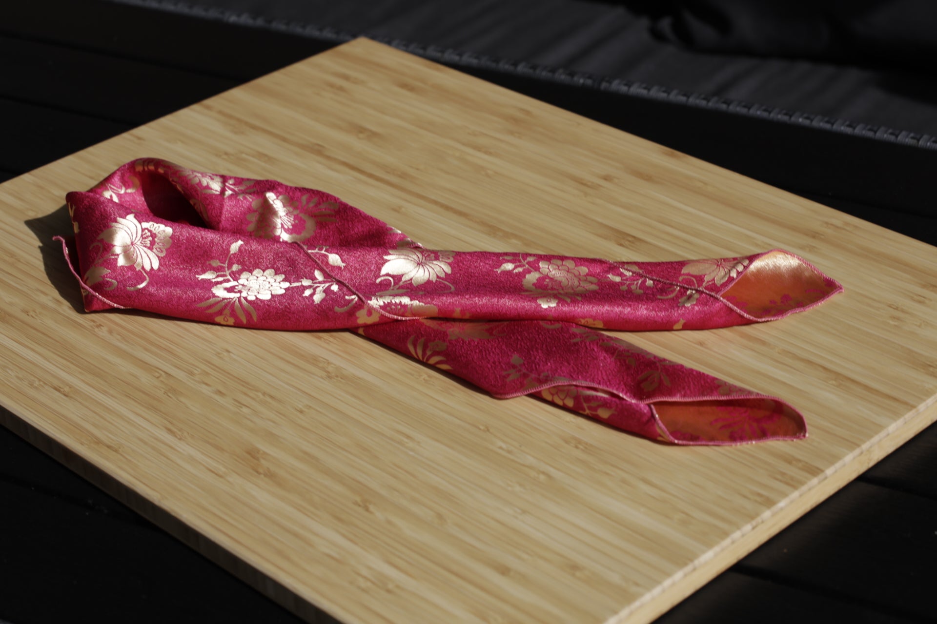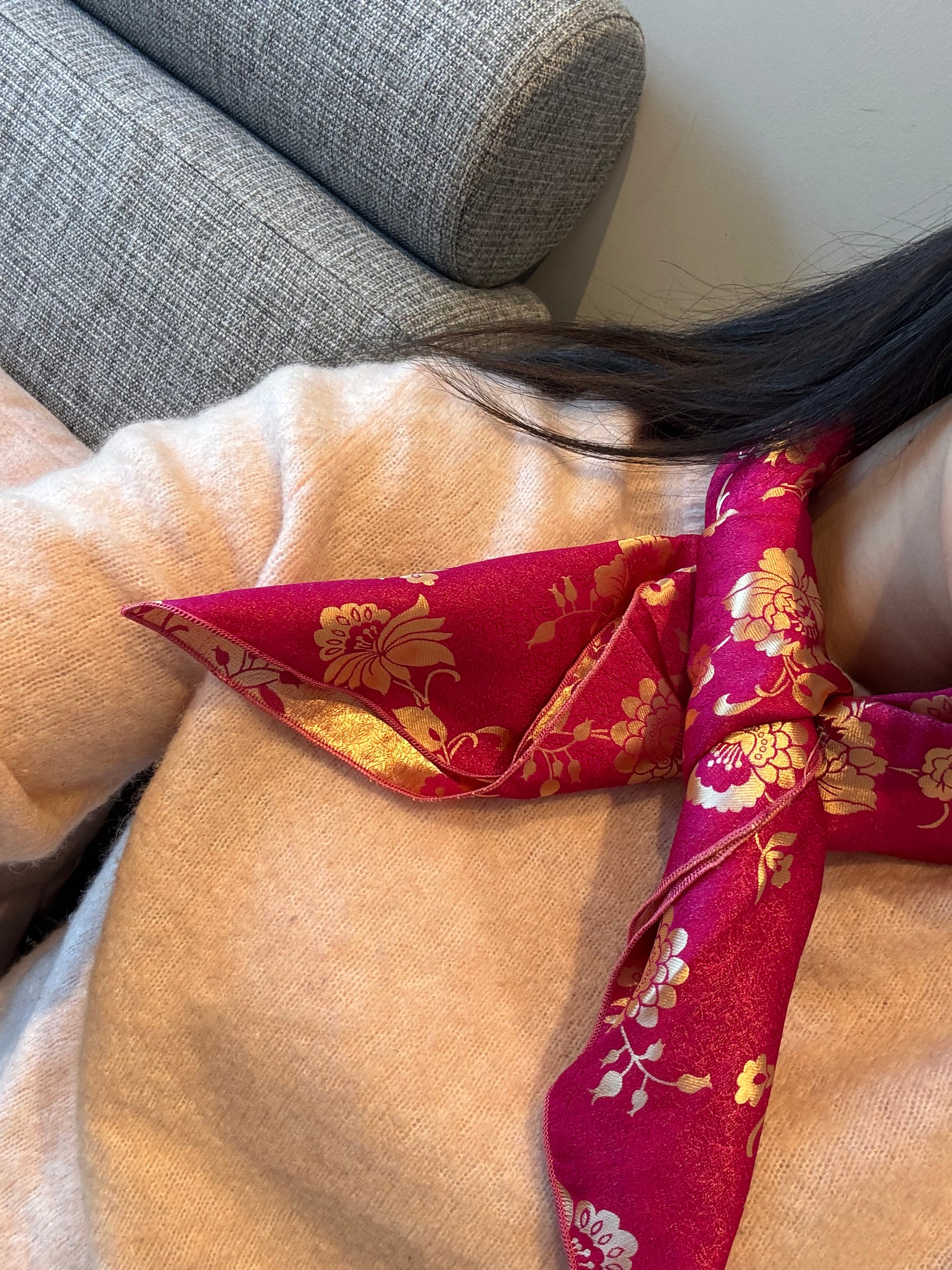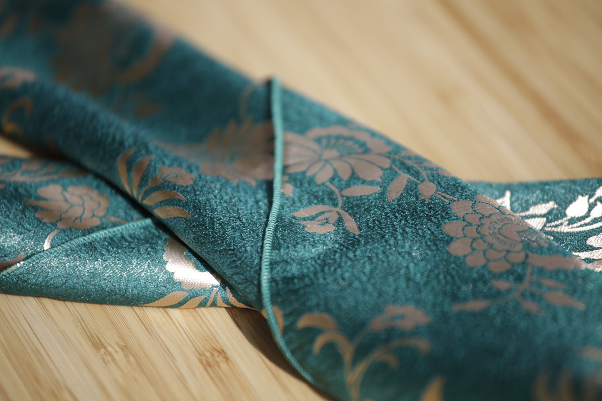 Silkebrokaden har vevde mønstre med vakre gulldetaljer og et uttrykksfullt fargespill. Stoffet er tosidig, mønsteret vises med motsatte farger på for- og vrangsiden, noe som gir skjerfet dybde og fleksibilitet i bruk. Et skjerf som virkelig skiller seg ut, og som gir et eksklusivt og personlig preg til bunad eller festdrakt. I brokadeskjerfene bruker jeg silketråd til å sy med.